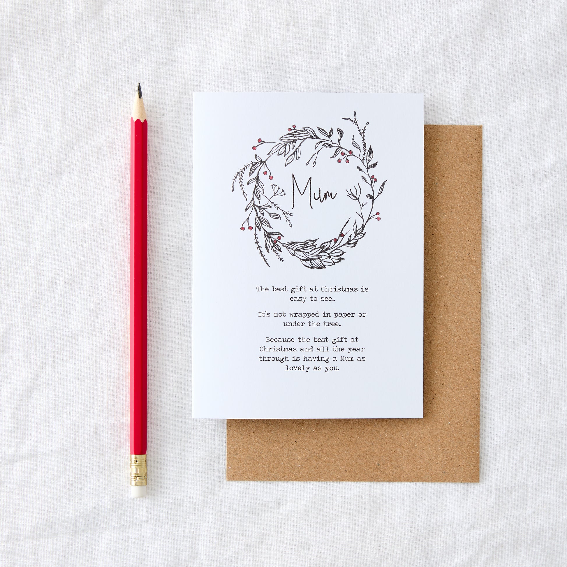 Beautifully simple design card, including text and wreath design. The design is printed on white card and comes with a recycled brown envelope.
