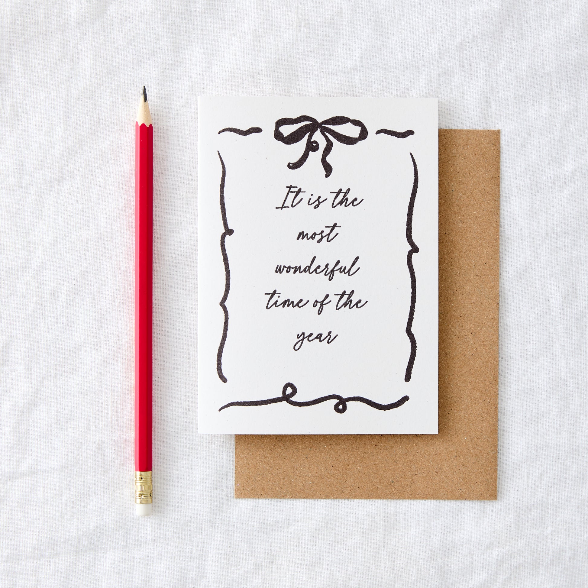 Beautifully simple design card, including text and a bow border. The design is printed on natural fleck card and comes with a recycled brown envelope.